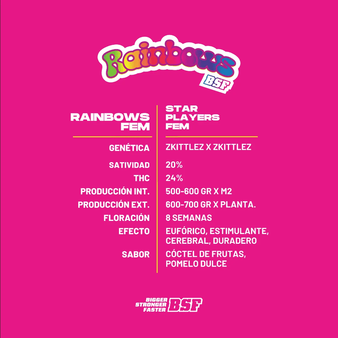 At BSF Seeds we continue to innovate, this time we bring a cross between Zkittlez characteristic sweetness and flavor. His daughter Rainbows acquires two characteristics from her ancestry that give her her name. First, its marked fruit cocktail flavor that ends with a SWEET grapefruit taste; second, the multiplicity of colors that can be seen with touches of violet, lilac, pink and green.