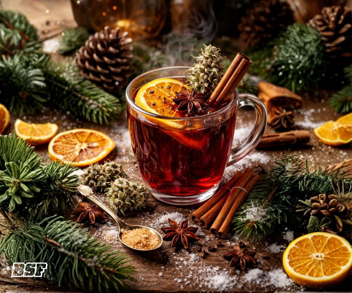 Calienta el vino a fuego bajo junto con las especias y la naranja, sin que hierva. Añade la miel o azúcar y retira del fuego. Incorpora la infusión cannábica ya dosificada, mezcla suavemente y sirve caliente. El resultado es un coctel cannábico de invierno aromático, envolvente y perfecto para el clima europeo.